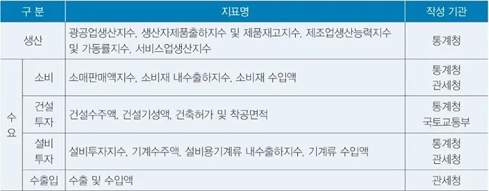 경기동향 분석에 사용되는 월별 경제지표는 대부분 통계청에서 작성하고 있습니다. 생산 활동을 나타내는 지표로는 전산업생산지수, 생산자제품출하지수 및 제품재고지수, 제조업생산능력지수, 가동률지수 등이 있습니다. 가계의 소비지출지표로는 소매판매액지수, 소비재 내수출하지수, 소비재수입액 등이 있습니다. 그리고 기업의 투자지출지표는 건설과 설비 투자로 구분되어 있습니다.