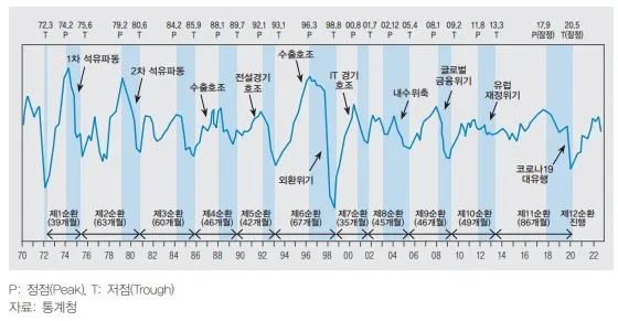 경기국면이 전환되는 정점과 저점이 발생한 구체적인 시점을 기준순환일(reference date)이라 고 하는데, 우리나라의 기준순환일은 경기종합지수(CI: Composite Index)를 작성하는 통계청이 동행지수 순환변동치, 생산·소비 등 주요 경기지표와 경제총량지표인 GDP, 관련 전문가들의 의견 등을 반영하여 결정 및 공표하고 있습니다.