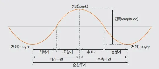 경기순환은 회복(recovery), 호황(boom), 후퇴(recession), 불 황(depression) 4개의 국면으로 나누어 집니다. 경우에 따라서는 확장(expansion)과 수축(contraction)의 2개 국면으로 구분하기도 합니다. 그리고 저점에서 다음 저점까지의 기간을 경기순환주기(business cycle)라고 하며, 저점에서 정점까지의 높이를 경기의 진폭 (amplitude)이라고 합니다.