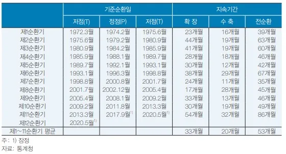 우리나라 경기의 순환주기는 평균 53개월이며 확장기와 수축기가 각각 평균 33개월 및 평균 20개월입니다. 우리나라의 순 환주기는 미국의 75개월이나 일본의 55개월에 비해 짧은 편인 특징이 있습니다.