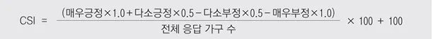 한국은행의 CSI는 BSI와 유사한 방식으로 산출되지만, 3점 척도(긍정, 보통, 부정)인 기업경기실사지수(BSI)와 달리 5점 척도(매우 긍정, 다소 긍정, 비슷, 다소 부정, 매우 부정)로 구분되어 있으며 정도에 따라 가중치를 부여하고 있습니다.