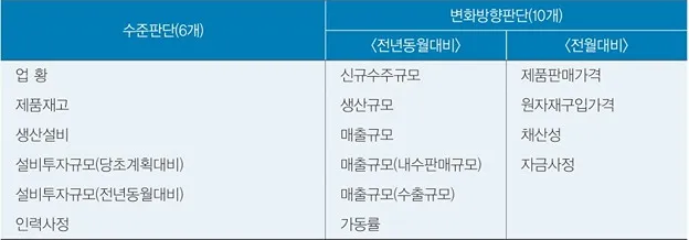 조사 항목은 모두 판단조사 항목으로 구성되어 있으며, 절대적인 수준 등을 묻는 6개 항목과 전년동월 또는 전월과 비교한 변화 방향을 묻는 10개 항목으로 구성되어 있습니다. 각 조사 항목 에 대한 업종별 지수와 함께 전 산업, 제조업, 비제조업 등 상위 산업에 대한 지수가 작성되며, 대기업과 중소기업, 중화학공업과 경공업, 수출기업과 내수기업 등 특수분류지수도 편제되고 있습니다.