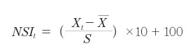 그리고 언론 논조에 의한 편의 가능성을 방지하고 학습데이터 및 감성분류기 변경에 따른 지수의 변동성을 줄이기 위해 원지수를 표준화 구간(2005년~전년)의 평균(X) 및 표준편차(S)를 이용하여 장기평균이 100, 표준편차가 10이 되도록 다음과 같이 표준화하였고, 이를 뉴스심리지수(NSI)로 정의하고 있습니다.