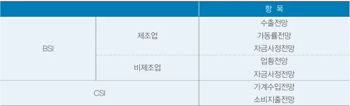 한국은행의 기업경기실사지수(BSI)는 실적지수와 전망지수가 같이 작성되며, 실물지표와 높은 상관관계를 보이고 있어 현재 또는 가까운 장래의 경기상황을 가늠하는데 유용한 것으로 평가되고 있습니다. 한편 한국은행 외에도 국내 기업경기실사지수 작성하는 기관이 있는데, 산업통상자원부의 중견기업경기전망조사, 중소벤처기업부의 중소기업경기전망조사 등이 있습니다.