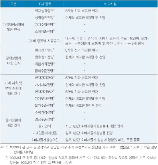 한국은행에서는 소비자동향지수(CSI)를 매월 15일을 전후 일주일에 걸쳐 조사하여 월말에 결과를 발표하고 있습니다. 조사대상 가구는 인구주택 총조사의 전국 도시 일반가구를 조사대상 모집단으로 설정한 후 지역별, 연령별로 층화하여 추출하는 방식으로 선정한 2,500가구입니다. 조사 항목은 소비자의 가계재정상황, 경제상황, 가계 저축 및 부채 상황에 대한 인식 등과 관련된 항목으로 구성되었고, 성별, 연령별, 주거지역별, 직업별, 소득계층별로도 구분하여 조사하고 있습니다.