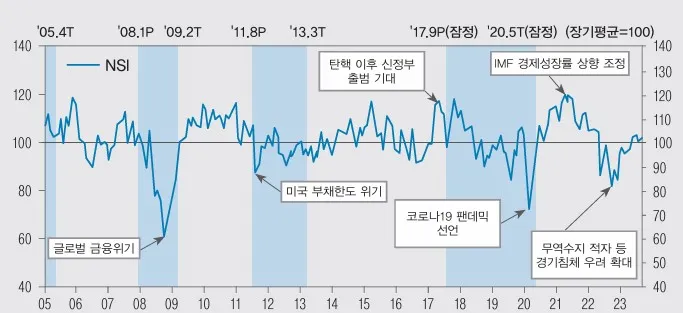 뉴스심리지수(NSI)는 100보다 크면 뉴스기사에 나타난 경제심리가 과거 장기평균보다 낙관적이며, 100 보다 작으면 비관적인 것으로 해석하면 됩니다. 표준화 구간은 매년 초 지수의 현실반영도 제고를 위해 전년 말까지 연장하고 과거 시계열을 소급 적용합니다. 뉴스심리지수(NSI)는 시차가 있지만 우리나라 경제상황이 긍정적이면 상승하고 부정적이면 하락하는 등 대체로 비슷한 움직을 보여줍니다. 예를 들면, 2020년 초 코로나19 확산으로 경기 저점을 기록하는 등 경제가 악화되는 시점에는 NSI가 큰 폭으로 하락하였고, 2021년 코로나19 충격에서 점차 회복되면서부터는 NSI도 점차 상승하는 모습을 보였습니다.
