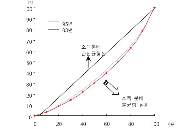 우리나라의 소득 분포 상황을 보여주는 로렌츠 곡선입니다. 우리나라의 소득 분포는 45도선에 미치지 못하고 아래로 볼록한 모양인데, 이것은 저소득층이 갖고 있는 소득의 비율이 낮음을 의미합니다. 곡선이 아래로 향할수록 부의 분포가 불균등함을 의미합니다.