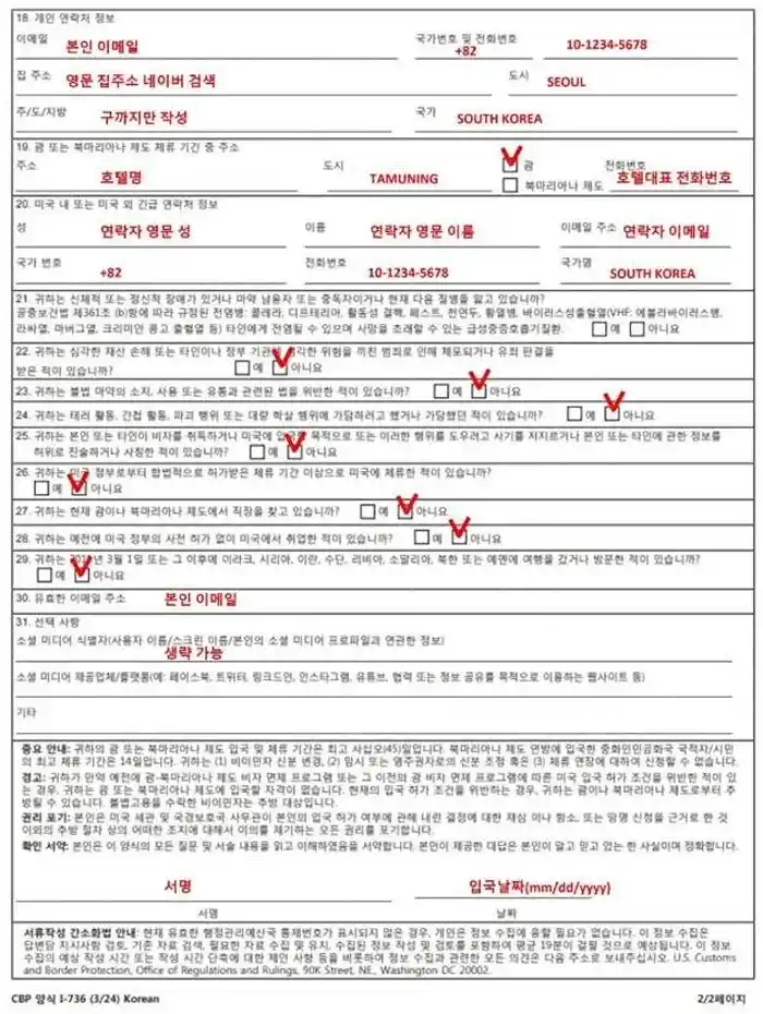 비자 면제 신고서 작성은 아래의 그림을 따라 하시면 됩니다. 글로 설명하기 보다는 아래 그림을 보고 그대로 따라하면 됩니다. 입국 심사 시에 반드시 필요한 사항이기 때문에 잊지 말고 준비하셔서 매끄러운 입국하시면 됩니다.