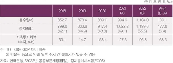 2022년 공공부문의 총수입은 1,104.0조 원으로 전년(994.9조 원)에 비해 109.1조 원 증가했으며, 총지출은 1,199.8조 원으로 전년(1,022.2조 원)에 비해 177.6조 원 늘어났습니다. 수입의 경우 법인세, 부가가치세 등 조세를 중심으로 늘어났으며, 지출의 경우 코로나19 방역 및 피해보상 등 관련 지출이 늘어나고, 원자재가격 상승으로 인한 공기업의 중간소비 등이 증가하였습니다. 이에 따라 공공부문의 저축투자차액(수지)은 –95.8조 원으로 적자규모가 전년(-27.3조 원)에 비해 68.5조 원 확대되었습니다.