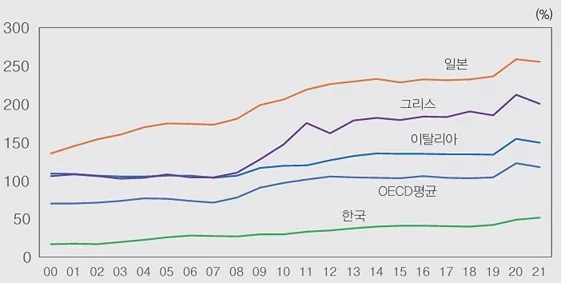 2021년 말 우리나라 일반정부 부채(D2 기준)의 명목GDP 대비 비중은 51.3%로 OECD 평균에 비해 상대적으로 낮은 수준입니다. 이는 정부가 경제성장 과정에서 재정건전성을 양호하게 유지해 왔음을 의미합니다. 선진국의 정부부채 비율이 높아진 것은 2008년 글로벌 금융위기 와 2020년 코로나19 감염병 확산 사태를 수습하는 과정에서 각국의 정부지출이 크게 늘어났기 때문입니다. 일본은 1980년대 후반 이후, 소위 잃어버린 20년으로 대변되는 장기간의 경기침체, 인구고령화 등의 영향으로 국가부채 비율이 세계에서 가장 높은 수준을 나타내고 있습니다. 한편, 유럽발 재정위기의 영향을 크게 받은 그리스, 이탈리아 등의 일반정부 부채 비율도 이후 코로나19 사태 등을 겪으며 높은 수준을 유지하고 있는 상황입니다.