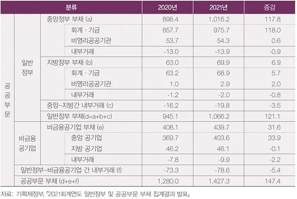 2021년 말 우리나라의 공공부문 부채는 1,427.3조 원으로 일반정부 부채 1,066.2조 원과 비금융공기업 부채 439.7조 원으로 구성되며, 연결(consolidated)기준으로 작성됨에 따라 78.6조 원이 내부거래로 상계된다.