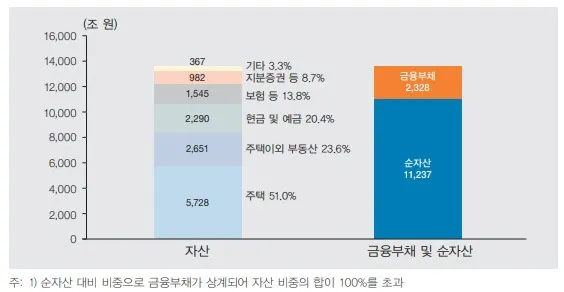 국민대차대조표는 가계, 기업, 정부 등 개별 경제주체들이 보유한 순자산 규모 및 구성내역에 관한 정보를 제공해 줍니다. 2022년 말 기준 경제주체별 순자산 수준을 보면 가계 및 비영리단체가 1경 1,237조 원으로 국부(2경 380조 원)의 55.1%를 차지해 가장 비중이 컸으며, 다음으로 일반정부(5,242조 원, 25.7%), 법인(3,902 조 원, 19.1%) 순으로 나타났습니다. 2022년 말 기준 가계 및 비영리단체의 순자산 구성내역을 살펴보면 주택이 51.0%로 가장 큰 비중을 차지하였고, 상업용 빌딩 등 주택 이외 부동산이 23.6%로 뒤를 이었습니다. 주택 및 주택 이외 부동산을 합한 비중은 74.6%로 부동산이 가계 자산의 대부분을 차지하였으며, 다음으로 현금 및 예금(20.4%), 보험 및 연금(13.8%), 지분증권 등(8.7%) 순으로 나타났습니다.