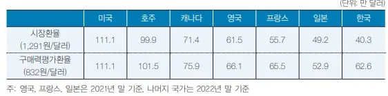 한편 가계 총자산을 추계가구로 나눈 가구당 순자산을 산출하여 우리나라 가계의 자산 수준을 국제비교해 볼 수도 있습니다. 2022년 말 기준 우리나라의 가구당 순자산은 5억 2,071만 원으로 추정되어 시장 환율로 환산한 금액은 40.3만 달러였으며, 이는 미국, 호주, 캐나다 등 주요 선진국 대비 낮은 수준이었습니다. 그러나 각국의 물가 수준을 비교하여 산출되는 구매력평가환율 기준으로는 62.6만 달러로 프랑스, 영국과 비슷하고 일본보다 다소 높은 수준으로 나타났습니다. 다만 위와 같은 국제비교 시 국가별로 자산 측정 방식 및 포괄 범위 등이 상이하고 시장환율로 비교 시 환율 변동성이 매우 높은 점 등에 유의할 필요가 있습니다.