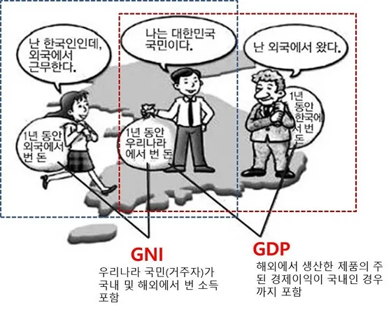 ① 국가라는 개념은 지리적 영역에만 국한되는 것이 아니며, 해외에서 생산된 재화와 서비스라도 그로 인해 발생한 시장가치를 취하는 경제주체가 속한 국가의 영역까지 포함합니다. 예를 들어 예를 들어 해외에서 생산된 휴대폰이라 하더라도 해당 기업의 경제적 소유권이 국내 기업에 있는 경우 휴대폰 생산은 우리나라 GDP에 포함되는 것입니다.