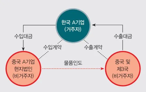 중계무역 흐름도를 보면, 한국의 A기업은 중국의 현지법인으로부터 수입계약을 체결하고 대금을 지급한 뒤 해당 물품을 국내로 반입하지 않고 중국 또는 제3국의 비거주자에게 판매하고 있습니다. 해당 거래는 통관 기준 무역통계에는 포착되지 않으나, 한국의 A기업이 수입계약을 통해 지급한 수입대금과 수출계약을 통해 받은 수출대금의 차액인 중계무역 마진이 상품수지(중계무역 순수출)에 반영됩니다.