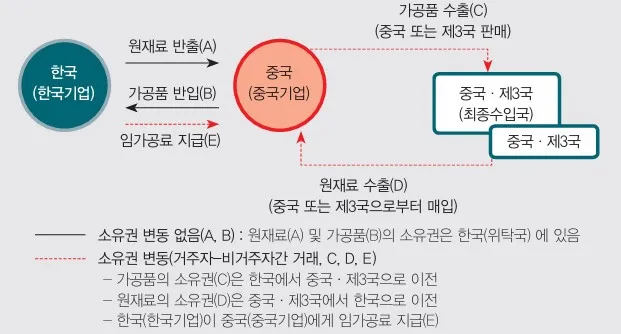 가공무역은 국내 위탁기업이 해외 가공업체에게 원재료, 중간재 등을 제공하고 가공품을 국내 로 반입하거나 해외에 판매하는 거래를 의미합니다. 반도체, 의류 등이 주요 가공무역 대상 품목에 해당합니다.