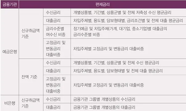 1991년 이후 금리자유화 추진 등을 배경으로 한국은행은 1996년부터 금융기관의 평균적인 여수신금리 수준을 측정하기 위하여 금융기관 가중평균금리통계를 발표하고 있습니다. 금융기관 여수신 가중평균금리는 아래의 표에서 보는 바와 같이 금융기관을 크게 예금은행과 비은행금융기관으로 구분하여 작성됩니다.