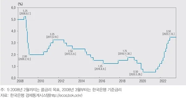 한국은행은 통화정책 운영체제를 물가안정목표제로 전환하기 이전인 1998년까지 물가안정, 경제안정 등 최종목표를 달성하기 위한 중간목표로 통화량을 채택하였습니다. 그러나 금융제도 개편, 금융혁신 등으로 통화지표의 안정성이 약화되고, 통화와 실물변수 간 관계가 모호해지는 등 통화정책의 유효성이 낮아짐에 따라 정책운용 중심지표를 통화량에서 금리로 바뀌었습니다. 특히 금리중시 통화정책으로의 전환은 1990년대에 추진된 금리자유화 정책 등의 영향으로 금리의 가격기능이 높아짐으로써 가능했던 것이다. 정책금리는 중앙은행 이 전적으로 그 수준을 결정하며, 이는 공개시장운영, 여수신제도와 같은 정책수단을 활용할 때 적용되는 금리의 기준이 됩니다. 한국은행은 1999년부터 2008년 2월까지는 콜금리(익일물)를, 2008년 3월 이후에는 기준금리를 정책금리로 사용하고 있습니다. 한국은행 기준금리는 금융통화위원회가 연 8회 결정하고 있고, 아래는 2008년 이후 한국은행 기준금리 변동 추이를 보여주고 있습니다.