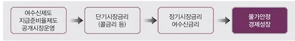 이상의 정책수단을 통해 한국은행이 단기시장금리에 영향을 주면 장단기 금융자산 간의 재정거래 등을 통하여 장기시장금리와 여수신금리가 변동하고 그에 따라 소비, 투자 등 실물 부문이 영향을 받게 됩니다. 이와 같은 통화정책의 파급경로를 금리경로라 하며 정책금리는 그 밖에도 기대경로, 환율경로, 자산가격경로 등 마치 블랙박스와 같은 매우 복잡한 경로를 통하여 실물경제에 영향을 미치고 있습니다.