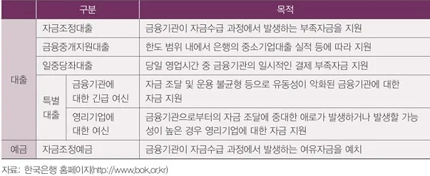다음으로 한국은행은 금융기관에 대한 대출금리를 변경하여 시장금리를 조절합니다. 예를 들어 한국은행이 은행에 대한 대출금리를 내리면 자금 조달 비용이 낮아져 은행이 기업에 대한 대출금리를 내리거나 채권을 보다 높은 가격으로 살 수 있게 됨으로써 시장금리가 하락하게 되는 원리입니다. 현재 한국은행이 상시적으로 운용하고 있는 대출제도로는 금융기관의 자금수급과정에서 발생한 부족자금을 지원하는 자금조정대출, 한도 범위 내에서 은행의 중소기업대출실적 등에 따라 자금을 지원하는 금융중개지원대출, 당일 영업시간 중 금융기관의 일시적인 결제 부족자금을 지원하는 일중당좌대출 등이 있습니다.