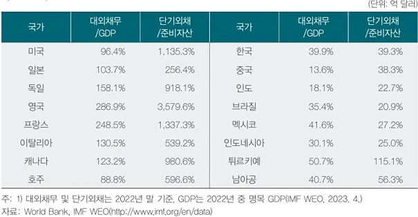각국의 대외채무 상황은 외환자유화 정도, 자본시장 개방도, 무역규모, 자국통화의 국제화 여부 등에 크게 영향을 받기 때문에 이들 지표를 모든 나라에 일률적으로 적용하여 국가 간 단순 비교를 하는 것은 적절하지 않을 수 있습니다.