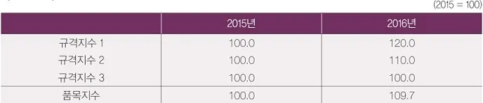 물가지수 작성 시 시장에서 거래되는 모든 상품들의 가격을 전수 조사하는 것이 이상적인 방법이지만, 사실상 불가능에 가깝기 때문에 실제로는 일정 기준에 의해 선정된 제품들인 표본을 대상으로 가격을 조사합니다. 국내에서 생산되는 TV 품목을 예로 들면, 시장에서 거래되는 모든 제품을 전부 조사하기보다는 시장점유율이 높은 상위 2개 회사의 대표 제품들과 여타 업체들을 대표할 수 있는 중견기업의 일부 제품들을 조사하는 것입니다. 규격지수는 조사제품(조사규격)의 기준연도 가격을 100으로 설정하여 지수화한 것입니다. 아래 표에서 규격 1의 가격이 2015년(기준연도) 200만 원에서 2016년 240만 원으로 20% 올랐으므로, 규격 1의 지수는 2015년 100에서 2016년 120으로 상승한 것입니다. 규격지수의 산식은 아래와 같습니다.