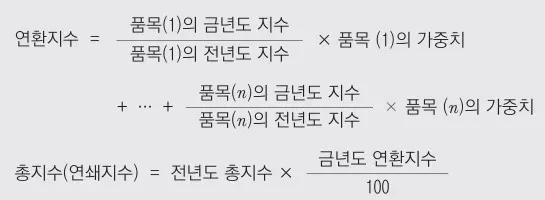 연쇄가중방식에서는 조사품목과 가중치를 매년 변경해주기 때문에 먼저 1년 단위의 가격변화를 나타내는 연환지수(short-term index)를 산출한 다음, 전년도 총지수에 금년도 연환지수를 곱하여 금년도 총지수에 해당하는 연쇄지수(chain index)를 산출하며, 연쇄가중방식에 의한 총지수 산출식 은 아래와 같습니다.