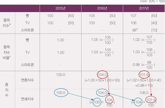 빵과 TV 및 스마트폰의 2016년도 대비 2017년도 품목지수비율은 각각 1.02(=107/105), 1.03(=106/103) 및 0.98(=98/100)이므로 이들을 가중평균하면 2017년도의 연환지수는 101.9(=1.02×50+1.03×40+0.98×10)가 됩니다. 이는 2017년도 한 해 동안 물가가 1.9% 상승하였다는 것을 의미하므로, 2016년도 101.9 총지수(104.0)에 2017년도 연환지수를 곱하면 2017년도 총지수(106.0 = (104.0 × 101. 9 /100 )를 구할 수 있습니다.