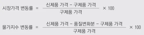 물가지수를 작성할 때 두 제품의 가격차이인 300만원이 전부 물가 상승으로 처리되지 않는데 이는 옵션 추가를 위해 부품이 사용되었고 연구개발비도 투입되었기 때문입니다. 따라서 이와 같은 기능(품질) 향상에 소요된 비용이 200만 원으로 추정된다면 이를 제외한 나머지 100만 원에 대해서만 물가 상승으로 처리하는 것입니다. 물가지수를 작성할 때 이처럼 시장가격을 그대로 이용하지 않고 품질조정을 실시하기 때문에 시장가격과 물가지수 등락률 간에는 일정부분 차이가 발생할 수 있습니다. 예시의 상황에서는 자동차의 시장가격은 약 11.1% 올랐지만 품질조정을 반영한 물가지수는 약 3.7%(=[(3,000-200 2,700)/2,700]×100)만 상승하게 되는 것입니다.