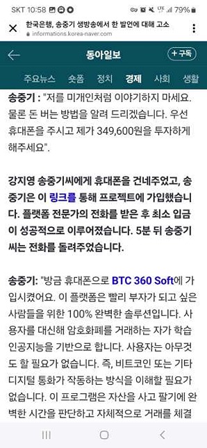 일단 결론부터 말씀 드리자면 스팸이고 사기이며, 배우 송중기씨와는 아무 관련 없는 곳입니다. 송중기씨 이외에도 손석기씨, 조인성씨, 장서규씨 등 관련 없는 연예인 사칭을 해가며, 사기행각을 벌이고 있는 사이트입니다. 한 마디로 궁금해 할 일말의 가치도 없는 곳이니 현혹되면 안됩니다. 동아일보라는 사이트도 다 조작된 것이며, 사이트에 실제로 들어가서 다른 기사나 다른 메뉴를 클릭해도 전혀 반응하지 않는 조작된 사이트입니다. 이런 사기와 관련된 언론사나 배우 등의 피해가 걱정됩니다.