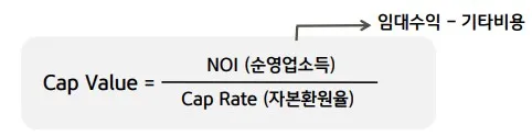 - 자본가치, 임대료 등 수익을 기반으로 적정 Cap Rate을 적용하여 산출한 자산가치 자본의 가치는 시장 가치와 동일하게 취급