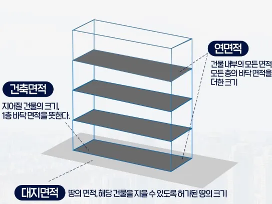 • 용적률: 대지면적에 대한 건축물 연면적의 비율, 지하층 면적은 제외