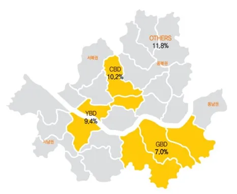 - GBD (강남업무지구, Gangnam Business District) 강남역, 삼성역을 중심으로 강남대로 및 테헤란로를 따라 펼쳐진 오피스 권역. 전통적으로 스타트업 및 IT기업 발달, 제조업, 기술 및 서비스, 의료업 등의 기업에 특화, 강남 대로 및 테헤란로 일대의 강남 권역
