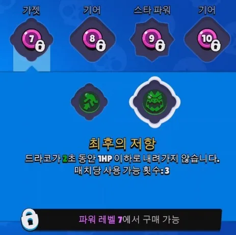 드라코가 2초 동안 1HP 이하로 내려가지 않습니다. 정말 활용도와 효율이 좋은 가젯입니다. 말 그대로 생존기로도 사용이 가능하고, 2스타파워인 슈레딩과 조합하면 드라코의 엄청난 생존력을 볼 수 있습니다. 슈레딩은 궁극기 드래곤 솔로를 사용하면 드라코의 체력이 회복되는데 최후의 저항을 사용한 상태로 드래곤 솔로를 사용해서 체력을 회복하면서 공격하다가 다시 드래곤 솔로를 사용하여 또 체력을 회복을 할 수 있기 때문입니다. 다만 위험한 타이밍을 잘 잡고 사용해야 비명회사 하지 않을 수 있습니다.