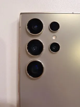 갤럭시(Galaxy) S24 Ultra의 다섯 개의 카메라입니다. 작은 카메라가 바로 100배 줌을 지원해 주는 렌즈입니다. 카메라가 돌출되어 있기 때문에 이를 보호할 수 있는 폰 케이스는 필수입니다.