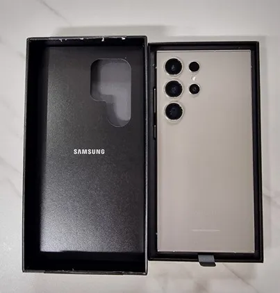 박스 개봉 후의 갤럭시(Galaxy) S24 Ultra의 모습입니다. 티타늄 그레이 색깔이 매우 고급스럽고 오랫동안 사용해도 질리지 않는 느낌입니다.