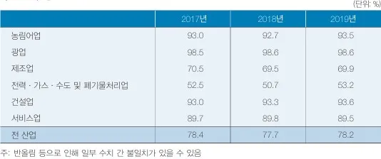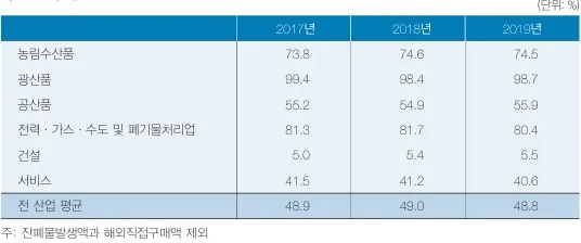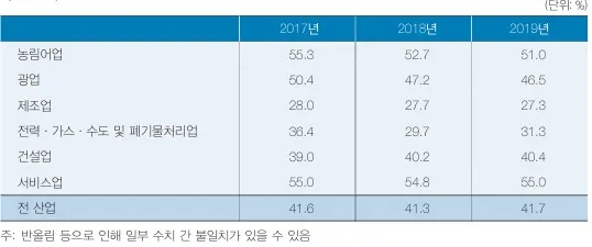 한편 부가가치 총액을 총투입액으로 나눈 비율을 부가가치율이라고 하는데, 2019년 부가가치율은 41.7%입니다.