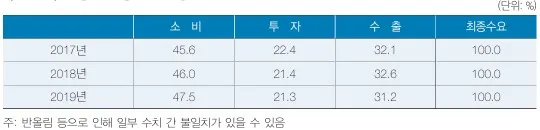 2019년 중 최종수요에서 차지하는 소비 비중은 47.5%였으며 수출과 투자의 비중은 각각 31.2%와 21.3%였습니다.