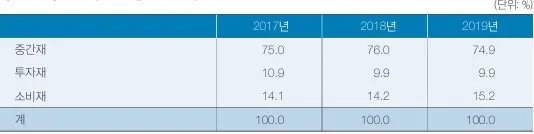 한편 2019년 중 우리나라 수입상품의 용도별 구성을 보면 중간재가 74.9%를 차지하였고 투자재 및 소비재의 비중이 각각 9.9%와 15.2%였습니다.