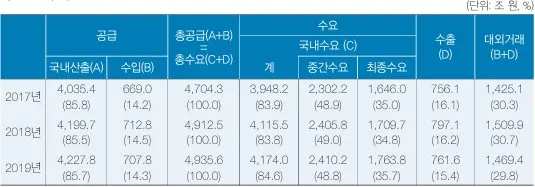 - 2019년 중 우리 나라에 공급된 재화와 서비스 총액은 4,935조 6천억원이며 그 중 85.7%(4,227조 8천억 원)는 국내생산으로 공급되고 나머지 14.3%(707조 8천억 원)는 수입을 통해 공급