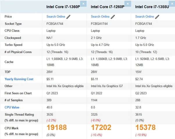 12세대 엘더레이크입니다. 비교 결과 삼성 DM530AFA-L78A의 인텔 i7-1360P가 가장 좋은 결과를 보여주었습니다.