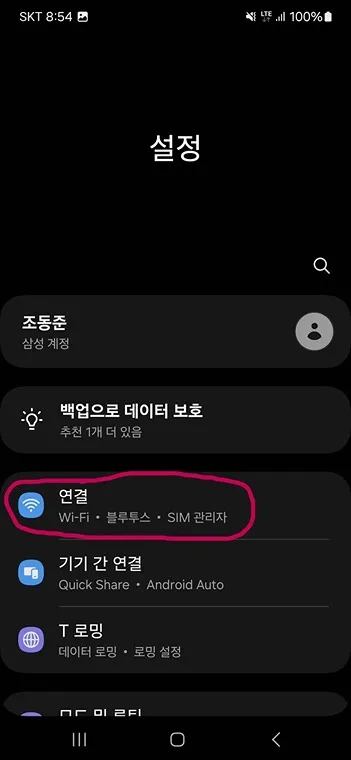 설정에 들어갔으면 연결 메뉴에 들어갑니다.