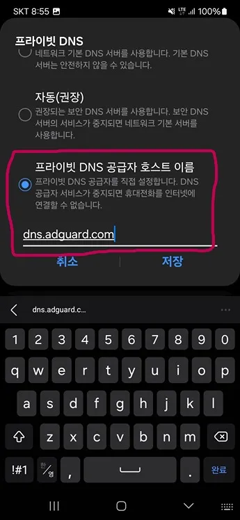 마지막으로 “프라이빗 DNS 공급자 호스트 이름”을 선택하시고 dns.adguard.com를 입력한 후 저장합니다.