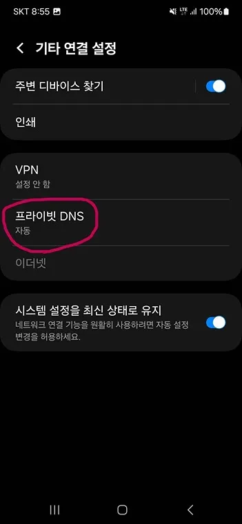 그리고 프라이빗 DNS를 누릅니다.