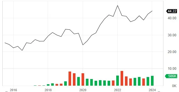 - 종목개요 : KSA는 사우디아라비아 주식에 직접 투자할 수 있는 제공한 최초의 ETF입니다. KSA는 시가총액의 99%를 차지하는 사우디아라비아 기업의 시가총액 가중 지수를 추종합니다. KSA의 41.65%가 금융 섹터에 집중되어 있으며, 약 8%정도는 아람코의 지분을 포함하고 있습니다. 이전에 아람코에 투자할 수 있는 유일한 방법이었으나, 아람코가 미국에 상장된 이후로는 그 매력도가 작아진 상황입니다.
