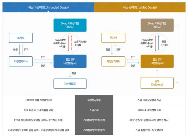 주식·채권 등의 기초자산을 편입하는 전통적인 ETF와 달리 장외스왑거래를 활용하여 지수를 복제하여 추종하는 ETF를 말합니다. 스왑계약에 따라 스왑 거래상대방이 기초지수 수익률을 제공하고, ETF 운용사는 거래상대방의 위험관리 등을 담당하게 됩니다. 합성 ETF는 스왑 거래상대방에게 담보 제공 여부에 따라 자금공여형(Funded Swap)과 담보를 제공하지 않고, 투자자금으로 직접 대체 자산을 매입하여 소유하는 구조의 자금비공여형(Unfunded Swap)으로 분류할 수 있습니다.