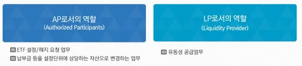 지정참가회사(Authorized Participants)는 ETF의 발행시장에서 법인투자자와 집합투자업자 사이에서 ETF의 설정 및 해지(발행시장) 신청의 창구 역할을 담당합니다. 지정참가회사는 이러한 ETF의 설정과 환매 업무를 통해 ETF가 시장에서 원활하게 거래되도록 하고, 그 가격이 좌당 순자산가치(NAV)에 일치되도록 노력하는데, 이를 위해 지정참가회사 중 1개사 이상은 집합투자업자와 유동성공급계약을 체결해 유동성공급자(Liquidity Provider)로서의 역할을 수행해야 합니다.