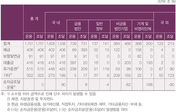 금융법인은 예금(393조 원), 보험 및 연금(91조 원), 유가증권 발행(209조 원) 등으로 외부 자금을 731조 원 조달하였고 영업이익 등으로 8조 원의 내부자금을 마련(저축)하였습니다. 그리고 이 자금으로 여타 경제주체에 대한 대출(397조 원), 비금융법인기업 등이 발행한 유가증권 매입(238조 원) 등의 금융거래를 통해 739조 원을 운용하였고 나머지 4조 원은 실물 부문에 대한 투자에 사용하였습니다.