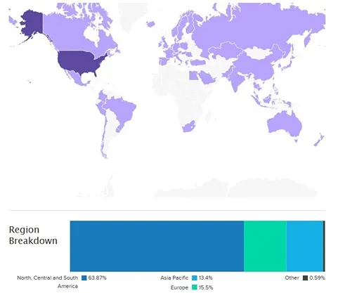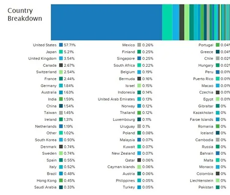 지역별 분산된 비율을 살펴보면 아래와 같습니다. 북, 중남미의 비율이 가장 높습니다. 아무래도 전 세계 경제대국 미국이 포함되어 있기 때문에 자연스러운 결과입니다. 미국의 구성비율은 무려 57.71%입니다. 반면에 한국은 0.93%로 초라합니다.