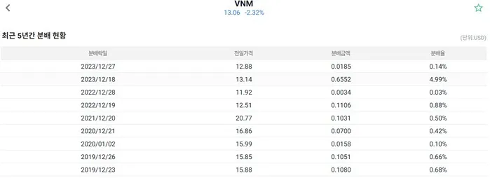 과거 VanEck Vietnam ETF(VNM) 배당금 지급 현황
